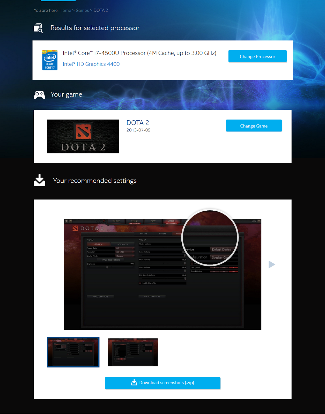 | Dalam contoh ini saya memilih Dota 2, seperti pada gambar di atas, disana terdapat screenshot dengan settingan optimal untuk game tersebut, anda juga dapat men-download screenshot tersebut dalam format zip |